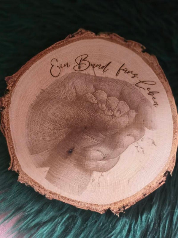 - Ich graviere dein Motiv präzise und detailreich auf die Holzscheibe.
