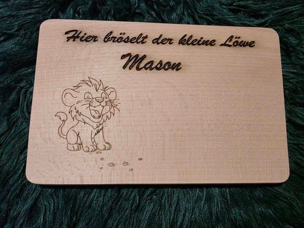 Wähle dein Lieblingsmotiv – Maus oder Löwe – und sende danach den Namen. Ich graviere dein persönliches Frühstücksbrett mit höchster Sorgfalt.